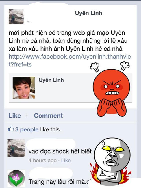 Sự việc này, chính Uyên Linh cũng biết từ khá lâu, nhưng cô đã không lên tiếng. "Trang giả mạo này đã có những lời xúc phạm nặng nề đến cá nhân Linh. Linh biết sự việc này khá lâu, nhưng nghĩ rằng không đáng quan tâm, vì mình còn rất nhiều việc để làm. Nhưng nay cảm thấy có nhiều bạn (không hiểu sao) vẫn tin đó là những phát ngôn của Linh, Linh cần đăng status này để bảo vệ cho hình ảnh của mình cũng như bày tỏ sự quan tâm đến những bất bình của người yêu mến Linh", Uyên Linh chia sẻ.