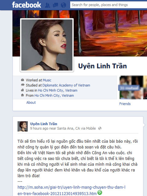 Không còn đủ bình tĩnh, Uyên Linh đã viết lên facebook của mình: "Tôi sẽ tìm hiểu rõ lại nguồn gốc đầu tiên nhất của bài báo này, rồi nhờ công ty quản lý gọi điện đến toà soạn và đặt câu hỏi. Đến khi về Việt Nam tôi sẽ phải nhờ đến công an vào cuộc. Chi tiết công việc ra sao tôi chưa biết, chỉ biết là tôi không thể không lên tiếng khi mà có những người vì kế sinh nhai của mình mà công khai chà đạp lên người khác, đem khó khăn và đau khổ của người khác ra làm trò đùa!".