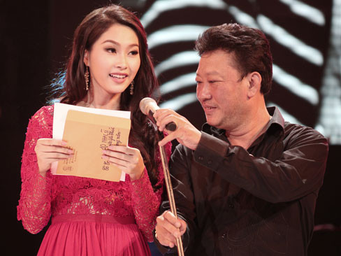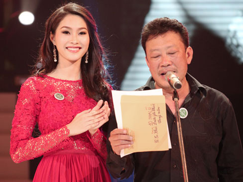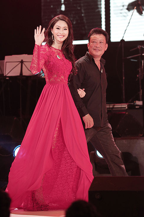 Trong bộ đầm ren của nhà thiết kế Lê Thanh Hòa, Thu Thảo thật nổi bật và rạng rỡ. Cô cùng với nhạc sĩ Lê Quang lên sân khấu để trao giải thưởng đầu tiên: Top 10 nhạc sĩ được yêu thích nhất 2012.