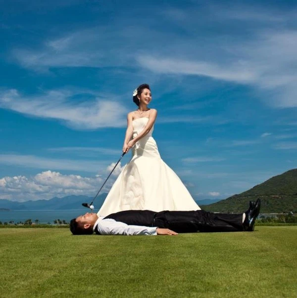 Trong một tấm ảnh, chú rể Đức Hải nằm dài trên sân golf và ngậm bóng trên miệng để cho cô dâu Jennifer swing. Bộ ảnh ngay sau khi được chia sẻ đã nhận được lời chúc phúc của đông đảo cư dân mạng.