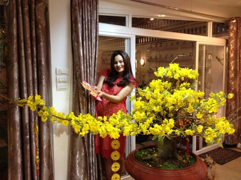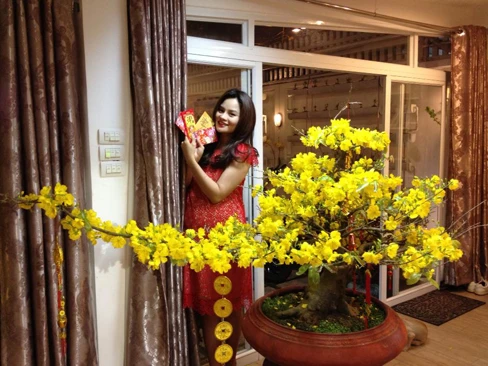 Mặc dù bụng bầu đã khá to nhưng tâm trạng Vũ Thu Phương vẫn rất thoải mái và vui vẻ, cô chia sẻ hình ảnh tạo dáng với bao lì xì bên mai vàng trong ngày mồng một tết.