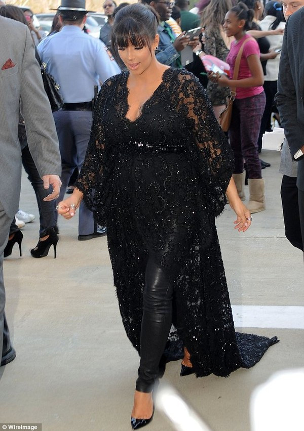 Gương mặt trang điểm nhẹ khiến Kim trông nhợt nhạt và thiếu sức sống. Cô nàng diện váy ren đen để lộ rõ bụng bầu đang lớn dần của mình tại buổi ra mắt ở Atlanta. Khi phỏng vấn với E! News , Kim thừa nhận rằng việc mang thai làm cô thấy mệt mỏi.