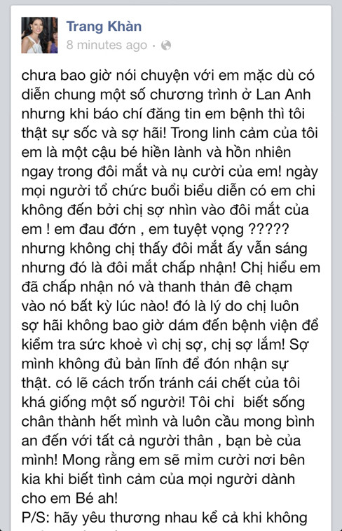 Trước đó, ngay khi thông tin về nam ca sĩ qua đời đã khiến cho giới showbiz bàng hoàng và tiếc thương cho một tài năng còn quá trẻ tuổi. Rất nhiều sao Việt đã gửi lời tiễn biệt tới anh thông qua trang facebook cá nhân.