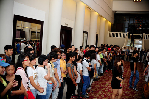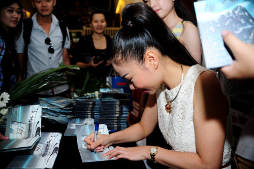 | Sau buổi họp báo, cô bận rộn ký tặng đĩa cho fan. |