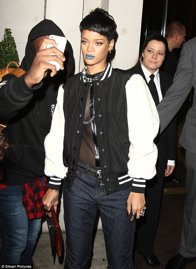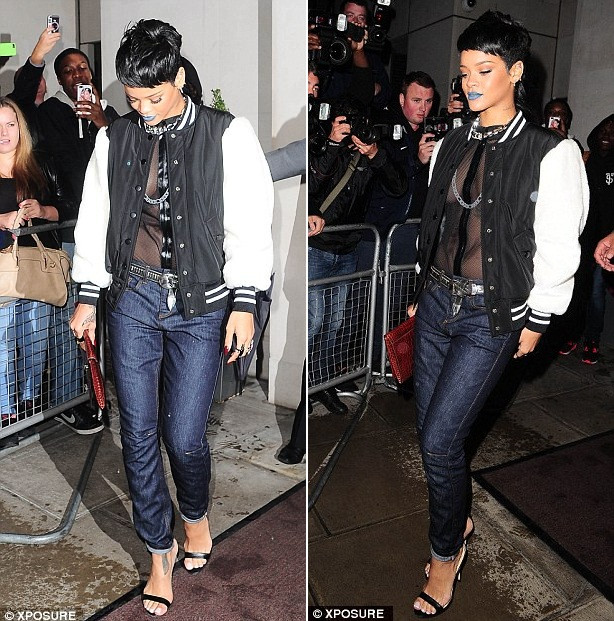 Nữ ca sĩ 26 tuổi diện áo lưới xuyên thấu vô cùng gợi cảm kết hợp cùng quần Jean và áo khoác nhưng điểm nổi bật nhất ở Rihanna lại là đôi môi xanh lét.