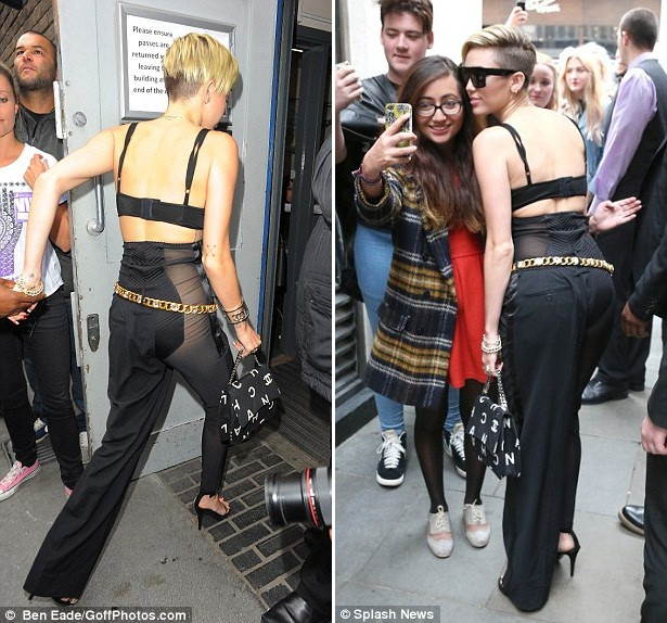 Vừa qua, Miley Cyrus đã xuất hiện bên ngoài studio Southbank, London. Nữ ca sĩ Wrecking Ball đã thu hút mọi sự chú ý của nhiều người trên phố với nội y màu đen cùng chiếc quần xuyên thấu gợi cảm khoe vòng ba.