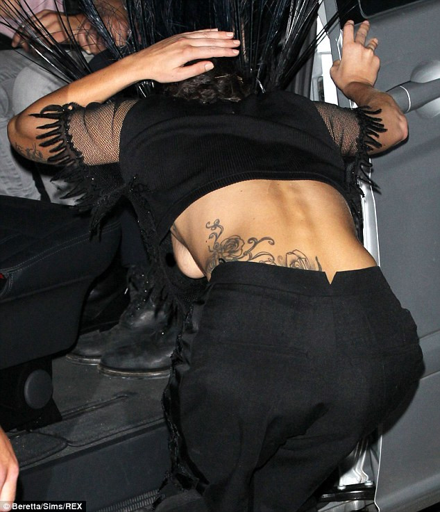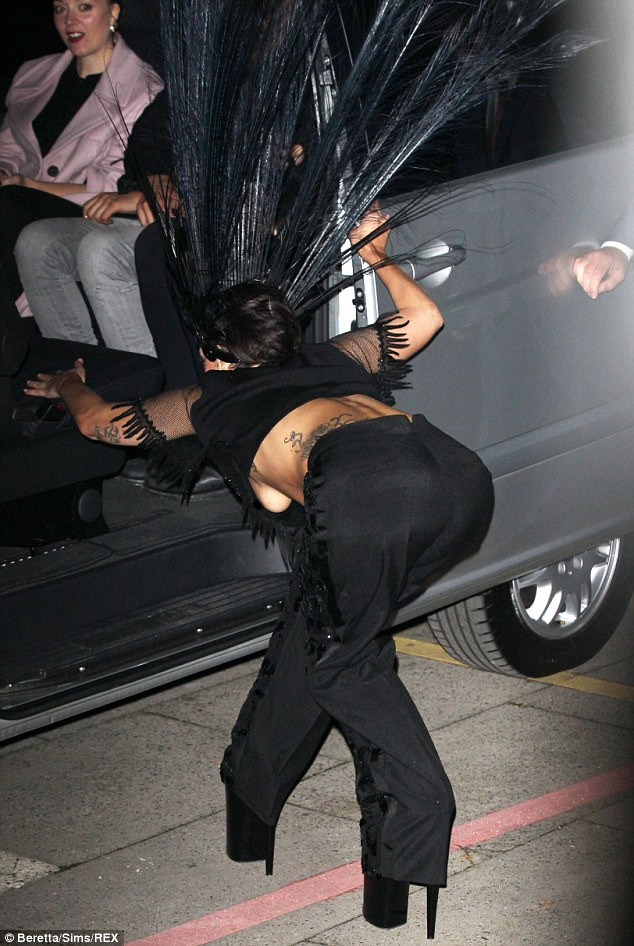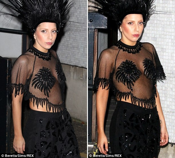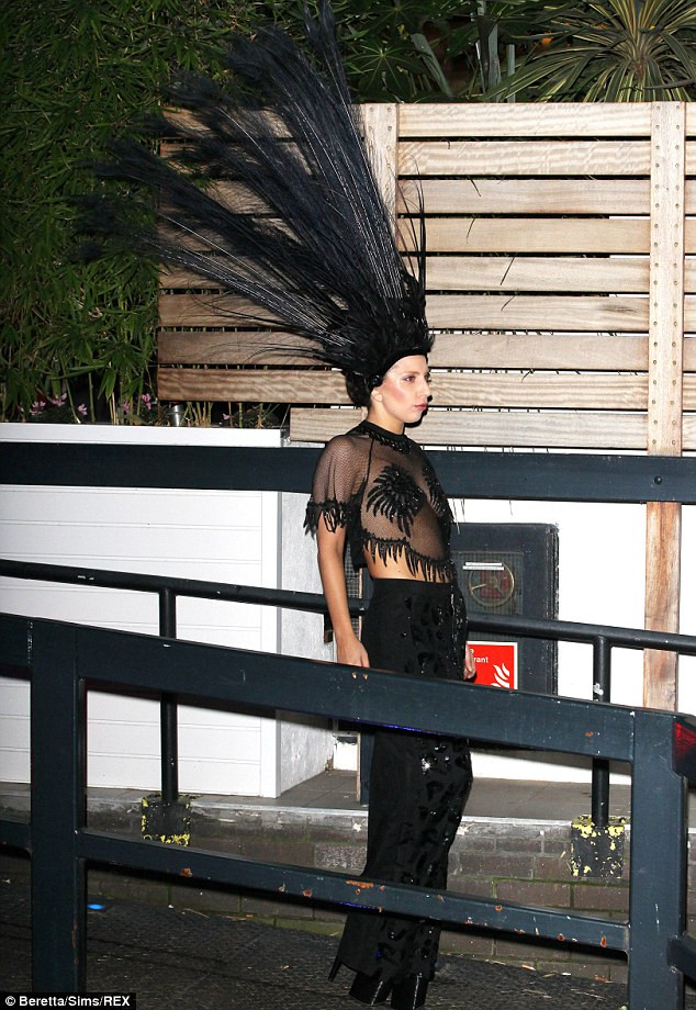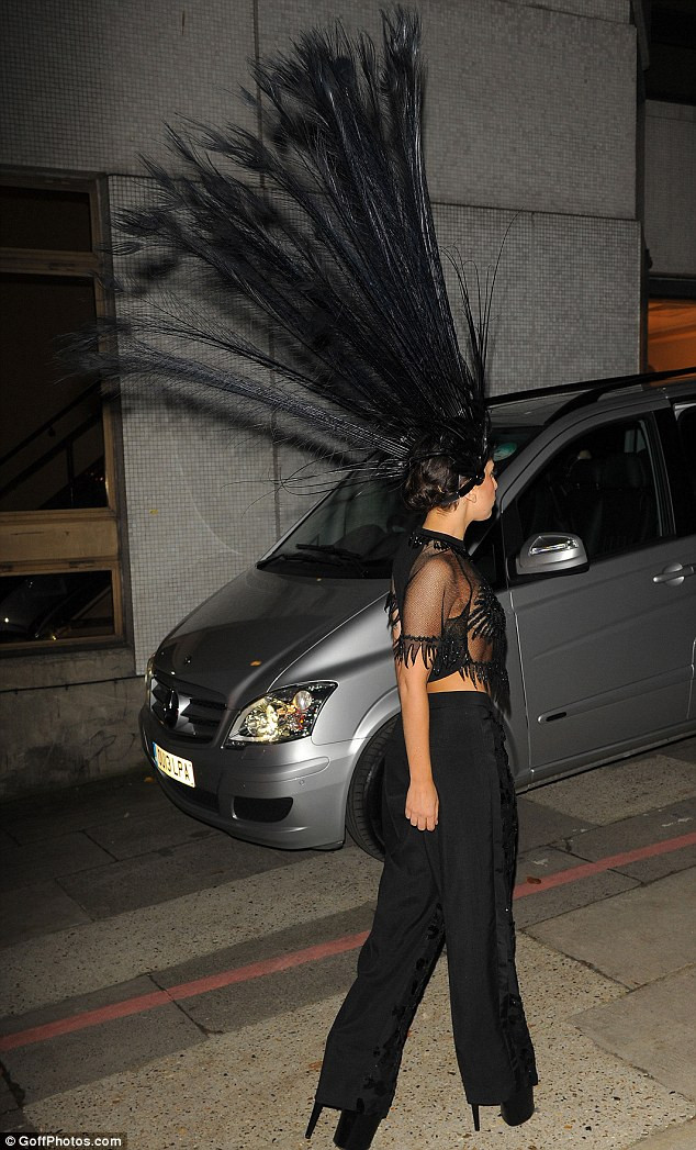 Nữ ca sĩ 27 tuổi diện trang phục đen tuyền với chiếc áo lưới xuyên thấu vô cùng gợi cảm và chiếc mũ chim công nổi bât.