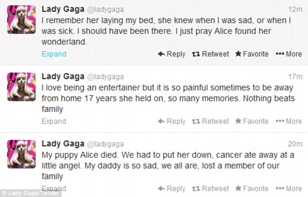 Bên cạnh đó, nữ ca sĩ Applause cũng chia sẻ tin buồn với lượng fan hùng hậu trên trang Twitter cá nhân về chú cún cưng Alice của cô: ‘Chú chó cưng của tôi đã qua đời rồi, chúng tôi sẽ phải chôn cất nó. Bệnh ung thư đã mang thiên thần nhỏ bé của tôi đi mãi mãi. Bố tôi rất buồn, tất cả chúng tôi đều cảm thấy mất mát vì thiếu đi một thành viên của gia đình.’