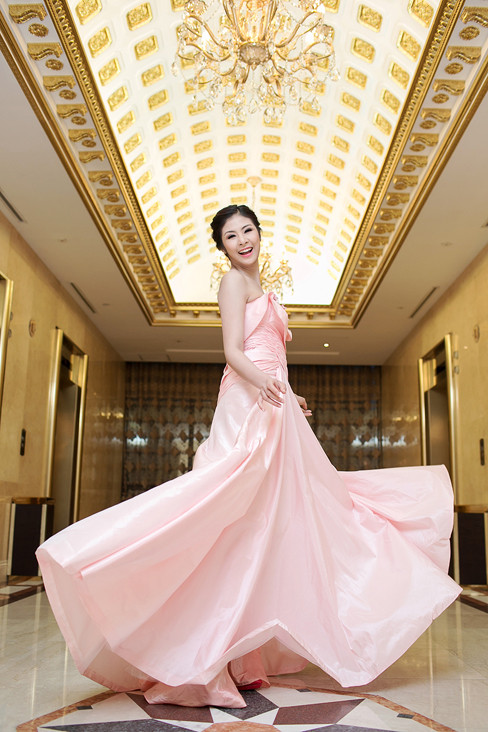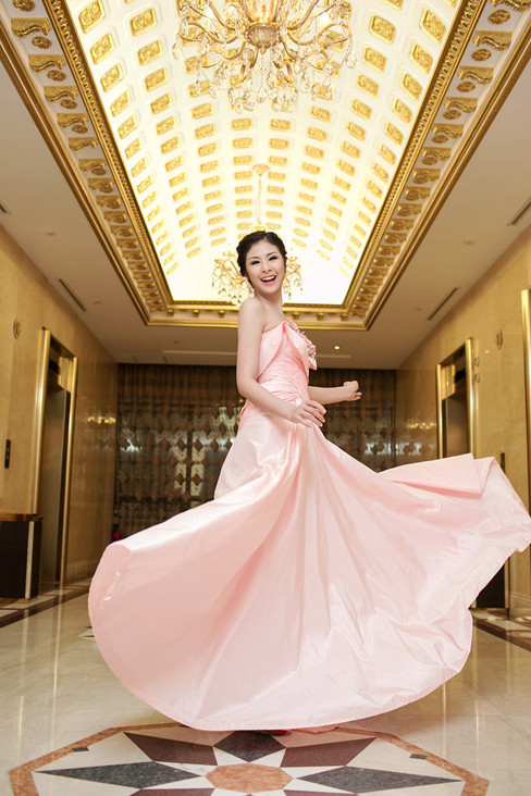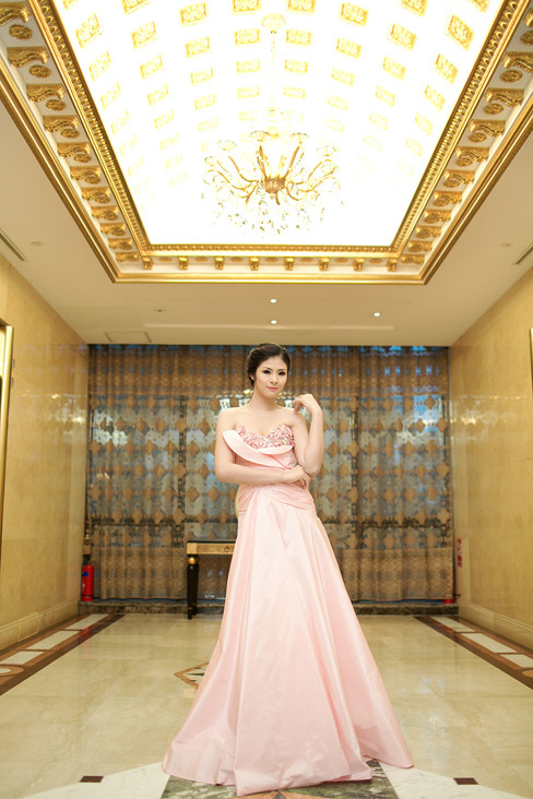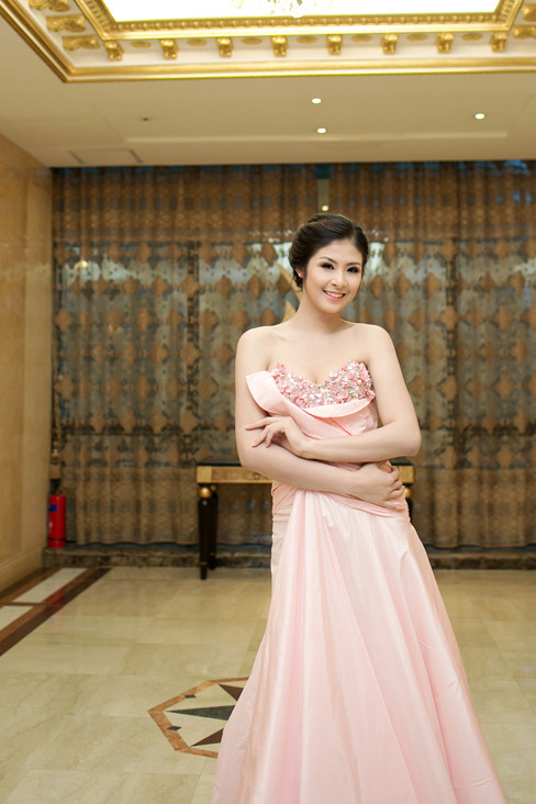 TPO - Hoa hậu Việt Nam 2010 diện bộ đầm dạ hội màu hồng nhạt khoe bờ vai trần thon thả và vòng một gợi cảm khi ra mắt với vai trò đại sứ thương hiệu cho một nhãn hàng gia dụng.