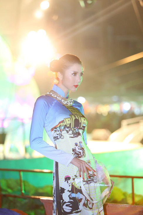 Trong chương trình, Ngọc Quyên diện tà áo dài có thiết kế độc đáo của nhà thiết kế Công Trí với họa tiết độc đáo, làm nổi bật nét kiêu sa và dịu dàng.