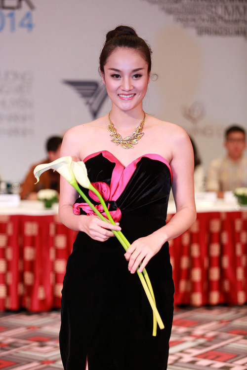 | Người đẹp biển Nguyễn Thị Loan mặc trang phục của NTK Công Khanh và được đích thân chủ nhân chăm chút tỉ mỉ trong buổi họp báo. |