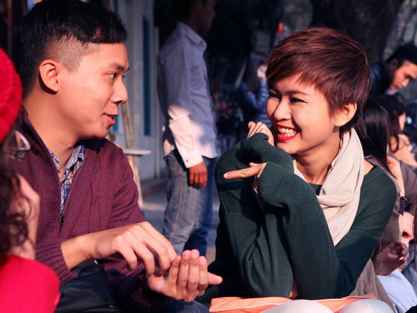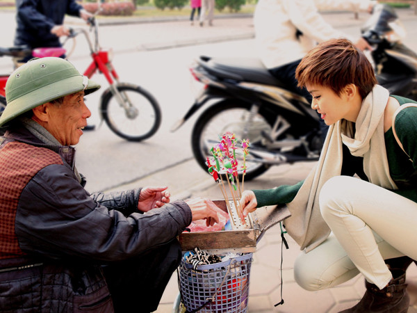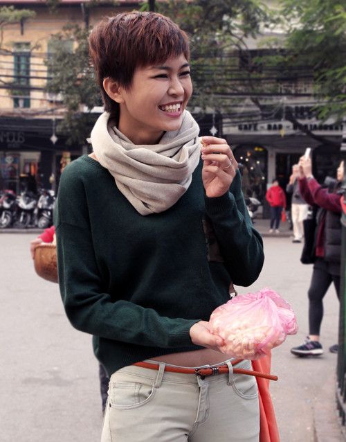 Tân quán quân tỏ ra vô cùng thích thú khi vừa trò chuyện cùng những người bạn vừa thưởng thức trà chanh lề đường và ngắm nhìn cảnh người qua lại nhộn nhịp, một nét thư giãn đặc trưng của người dân nơi đây. Cô thả hồn vào cảnh đẹp lãng mạn của đường phố Hà Nội và tận hưởng những điều bình dị và đáng yêu nhất.