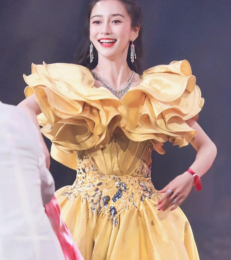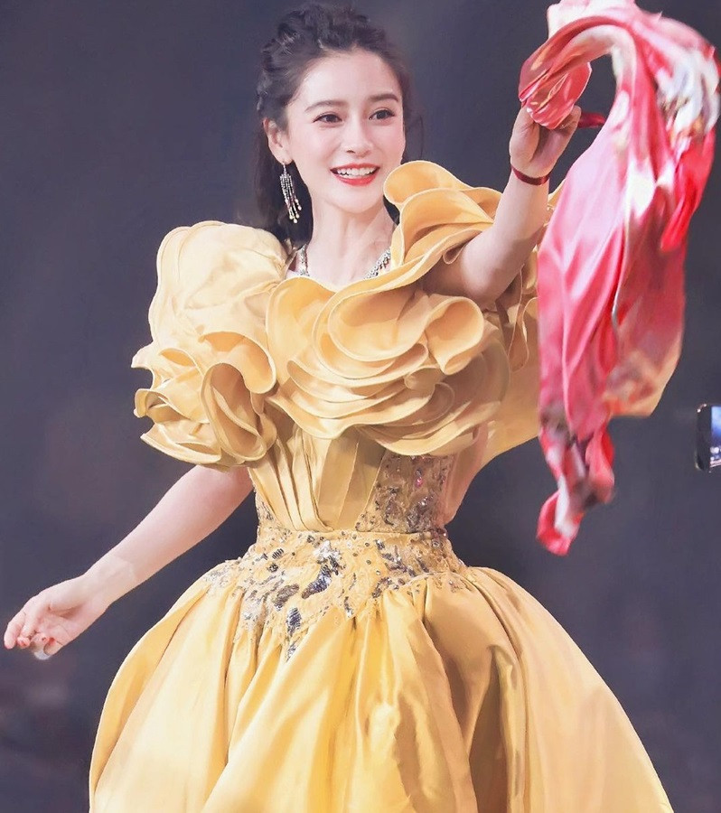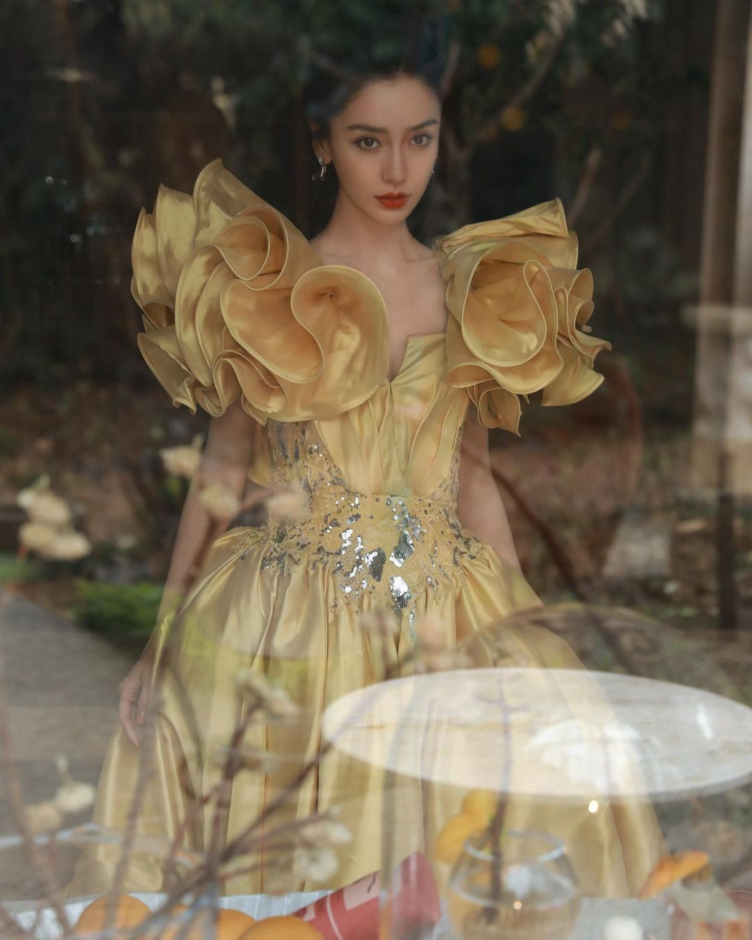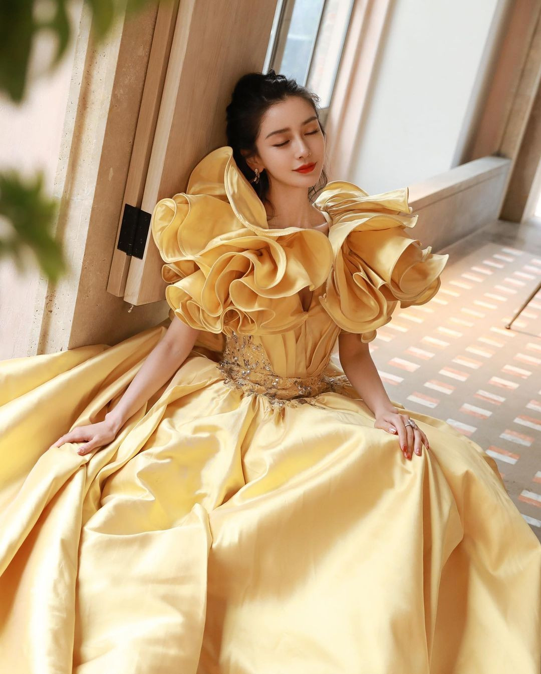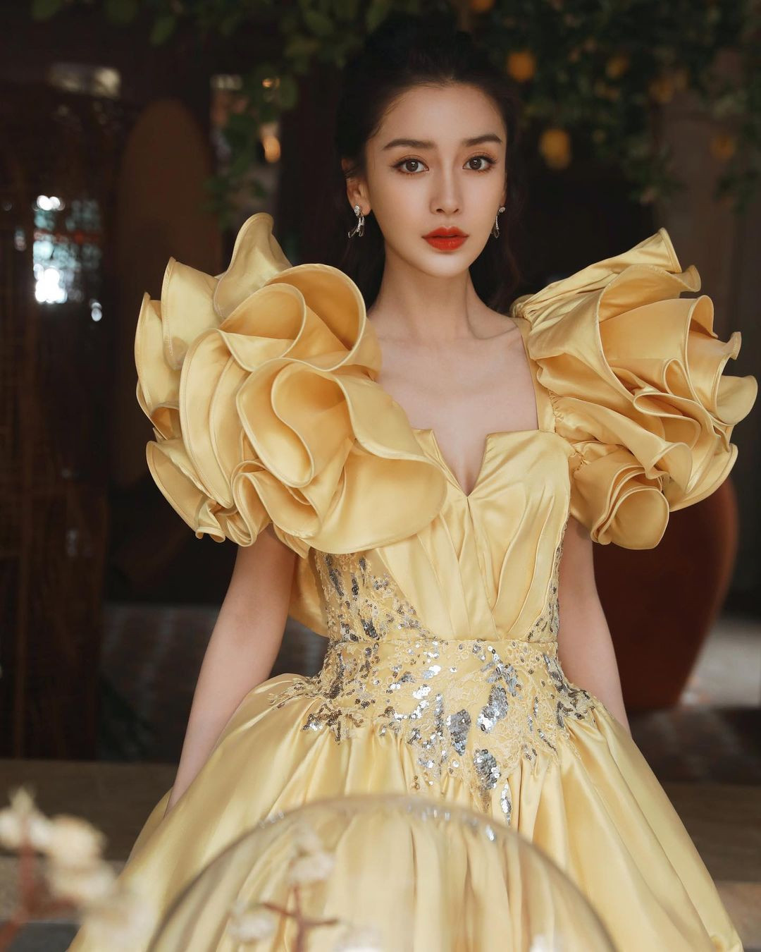 Mỹ nhân Hoa ngữ yêu kiều lộng lẫy như công chúa với đầm vàng lấp lánh.