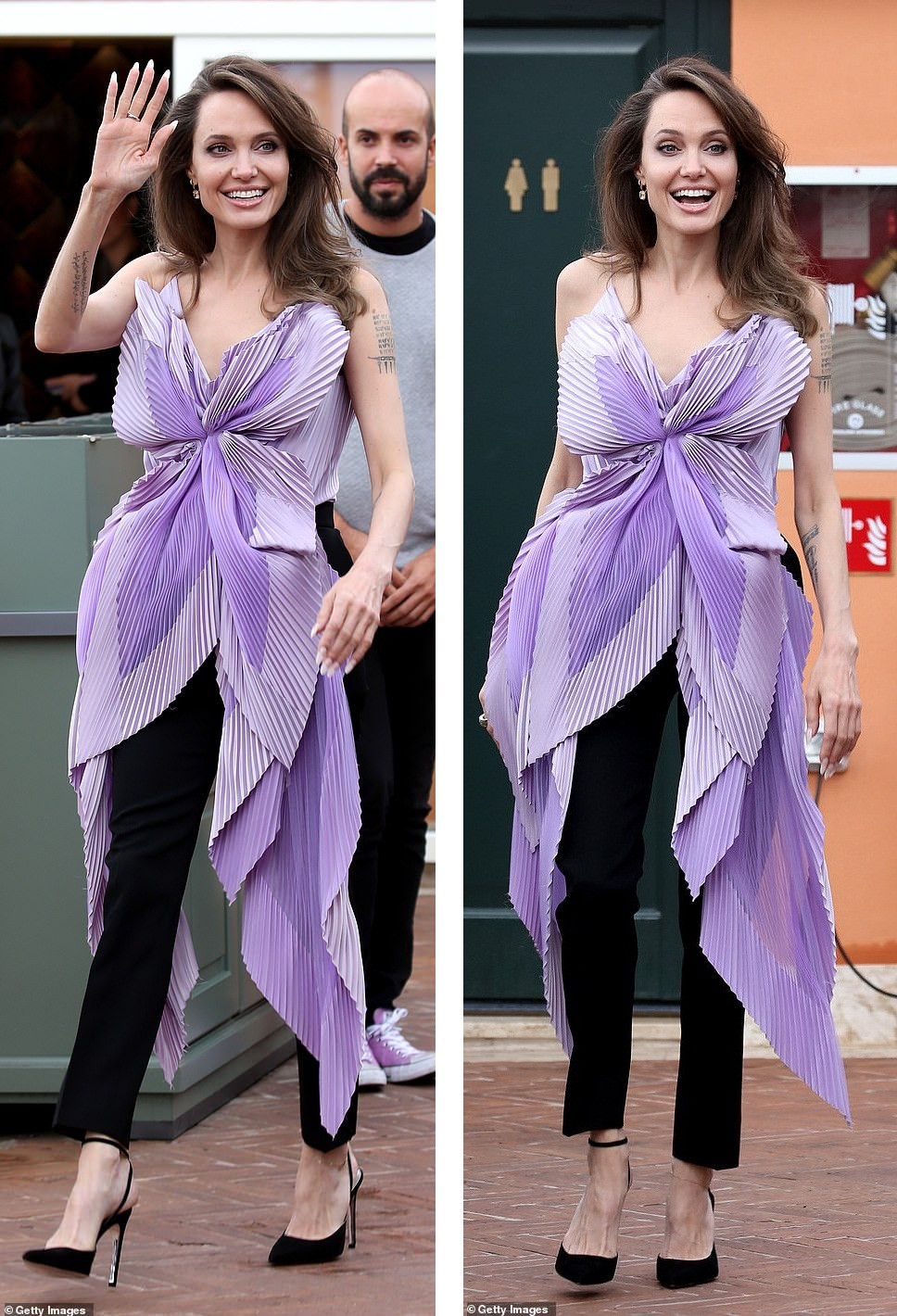 Angelina Jolie trở thành tâm điểm chú ý khi diện áo hai dây dáng dài màu tím, nổi bật với chi tiết cánh hoa ở mặt trước. Được biết, đây là thiết kế trong BST Xuân/Hè 2019 của Givenchy Couture.