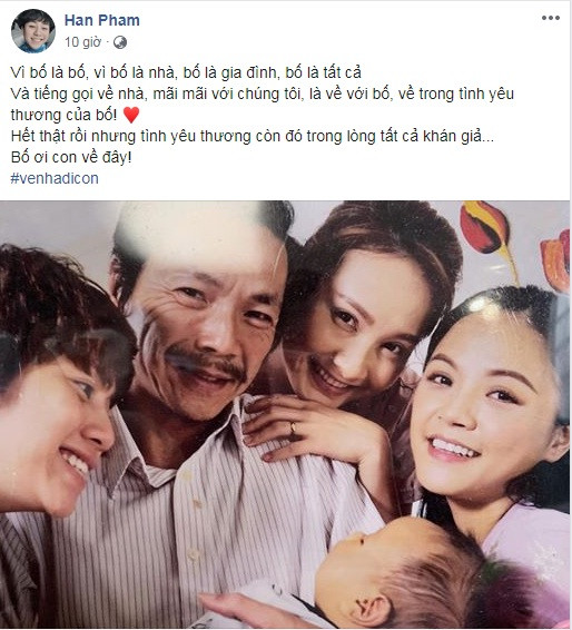Tối 12/8, tập cuối bộ phim "Về nhà đi con" lên sóng khiến nhiều khán giả không khỏi tiếc nuối. Trên trang cá nhân, diễn viên Bảo Hân- người vào vai Ánh Dương chia sẻ xúc động: “Vì bố là bố, vì bố là nhà, bố là gia đình, bố là tất cả. Và tiếng gọi về nhà, mãi mãi với chúng tôi, là về với bố, về trong tình yêu thương của bố! Hết thật rồi nhưng tình yêu thương còn đó trong lòng tất cả khán giả... Bố ơi con về đây!”.