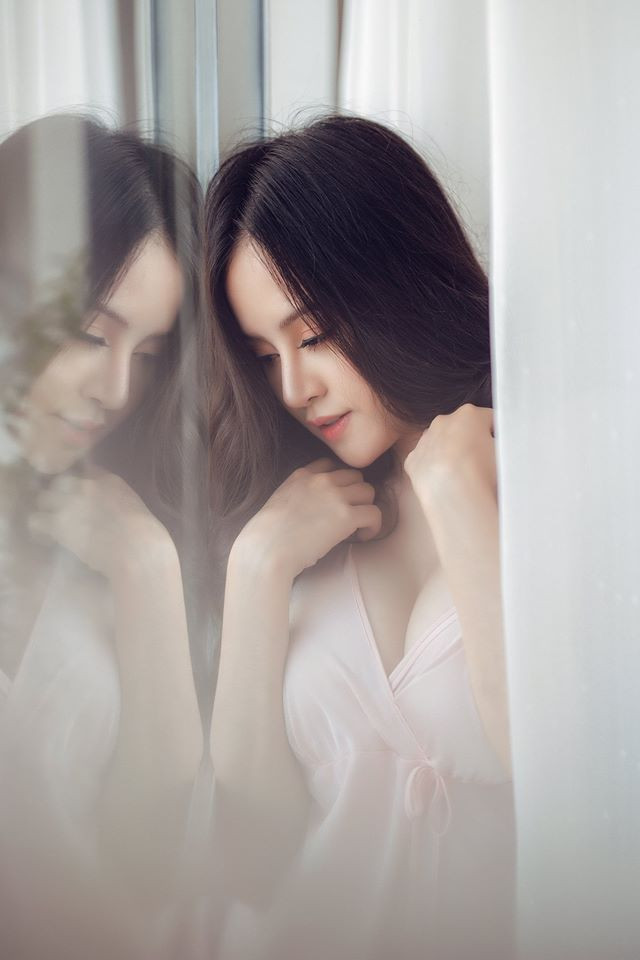 Trong hình hot girl sinh năm 1993 diện bộ đồ ngủ màu hồng trễ vai và khoét sâu để khoe vòng 1 nóng bỏng.