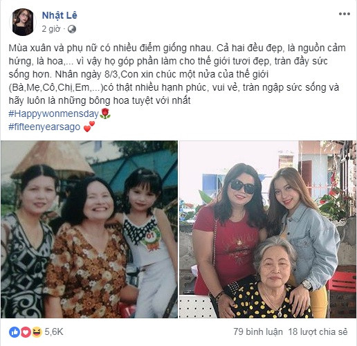 Trên trang cá nhân, bạn gái Quang Hải chia sẻ hình ảnh chụp cùng mẹ và bè kèm dòng trạng thái: “Mùa xuân và phụ nữ có nhiều điểm giống nhau. Cả hai đều đẹp, là nguồn cảm hứng, là hoa,... vì vậy họ góp phần làm cho thế giới tươi đẹp, tràn đầy sức sống hơn. Nhân ngày 8/3, con xin chúc một nửa của thế giới (Bà, Mẹ, Cô, Chị, Em,...) có thật nhiều hạnh phúc, vui vẻ, tràn ngập sức sống và hãy luôn là những bông hoa tuyệt với nhất”.