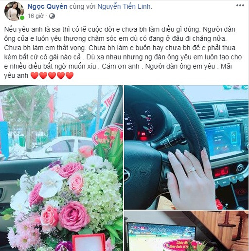 Trên trang cá nhân, Ngọc Quyên hạnh phúc viết: “Nếu yêu anh là sai thì có lẽ cuộc đời em chưa bao giờ làm điều gì đúng. Người đàn ông của em luôn yêu thương chăm sóc em dù có đang ở đâu đi chăng nữa. Chưa bao giờ làm em thất vọng. Chưa bao giờ làm em buồn hay chưa bao giờ để em phải thua kém bất cứ cô gái nào cả . Dù xa nhau nhưng người đàn ông yêu em luôn tạo cho em nhiều điều bất ngờ muốn xỉu. Cảm ơn anh. Người đàn ông em yêu. Mãi yêu anh”.
