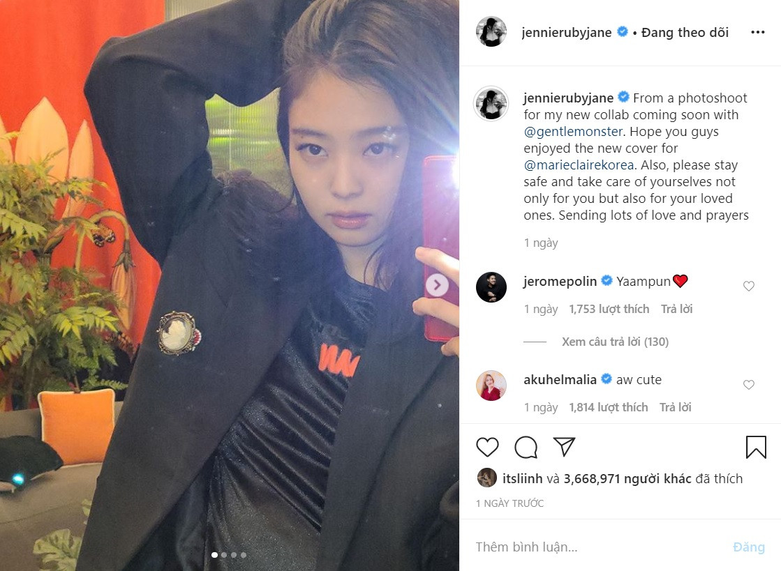 Trước cơn sốt về tầm phủ sóng mãnh liệt trên các trang đầu tạp chí lớn, "Lục đại nữ hoàng" Jennie Kim càng được đánh giá cao khi không quên dặn dò fans giữ sức khỏe trong mùa dịch COVID 19.