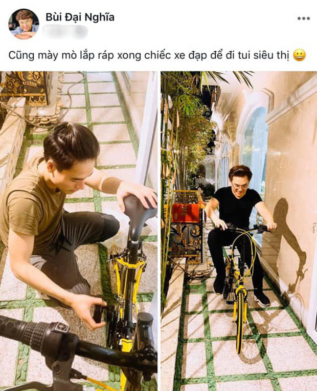 MC Đại Nghĩa cũng chia sẻ hai bức ảnh cả anh và Tấn Phát chụp với một chiếc xe đạp. “Cũng mày mò lắp ráp xong chiếc xe đạp để tui đi siêu thị”, anh viết.