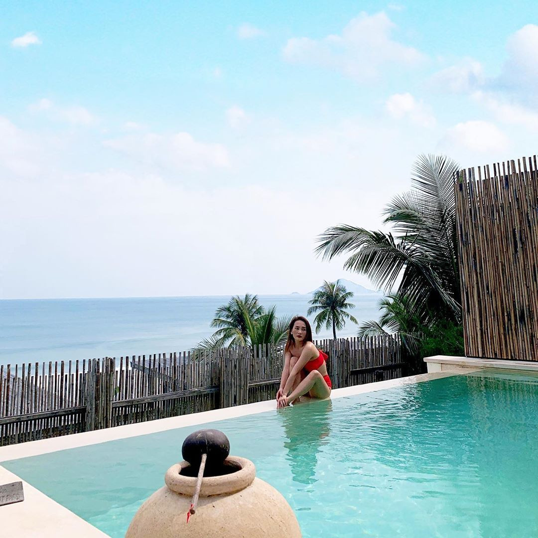 Cụ thể, nữ diễn viên chia sẻ bức ảnh mặc bikini chụp tại Côn Đảo kèm dòng trạng thái dí dỏm: “Các mẹ có nhìn thấy ngấn mỡ ở bụng em không? Mỡ đấy, ăn cho lắm vào".