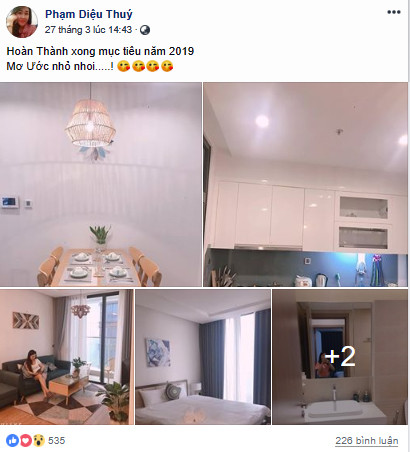 Bất ngờ vợ thứ ba của Hiệp Gà mua nhà 10 tỉ sau ly hôn ảnh 2Theo đó chị viết, "Hoàn thành xong mục tiêu năm 2019. Mơ ước nhỏ nhoi!". Qua những bình luận qua lại giữa Diệu Thúy và bạn bè ngay dưới bài viết thì Diệu Thúy vừa mua căn hộ trên (Ảnh: FBNV).