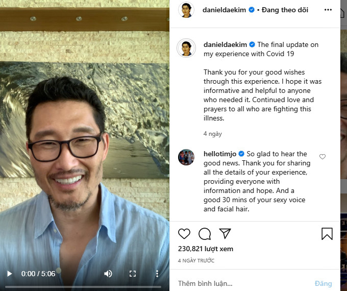 Daniel Dae Kim tuyên bố tự khỏi COVID-19 trên tài khoản Instagram có hơn 484.000 người theo dõi.