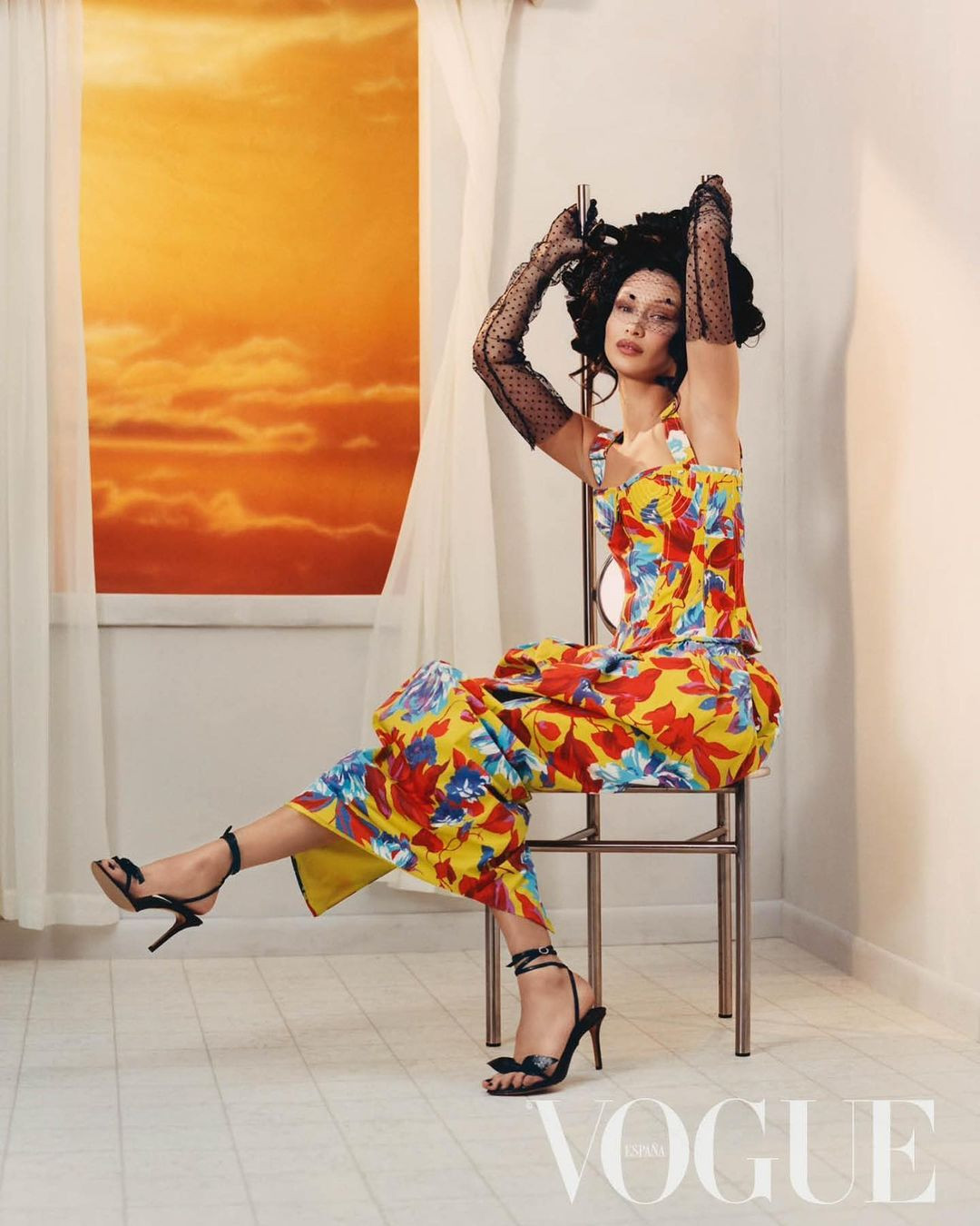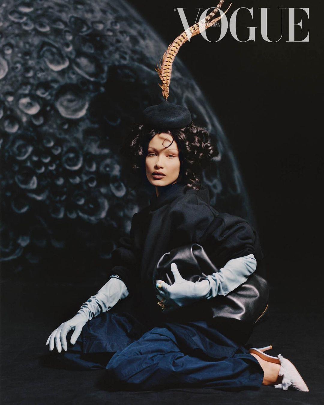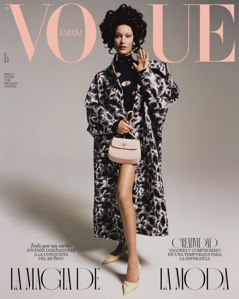 Bella Hadid diện trang phục của Prada, khoe chân dài thon thả nuột nà trên bìa Vogue.