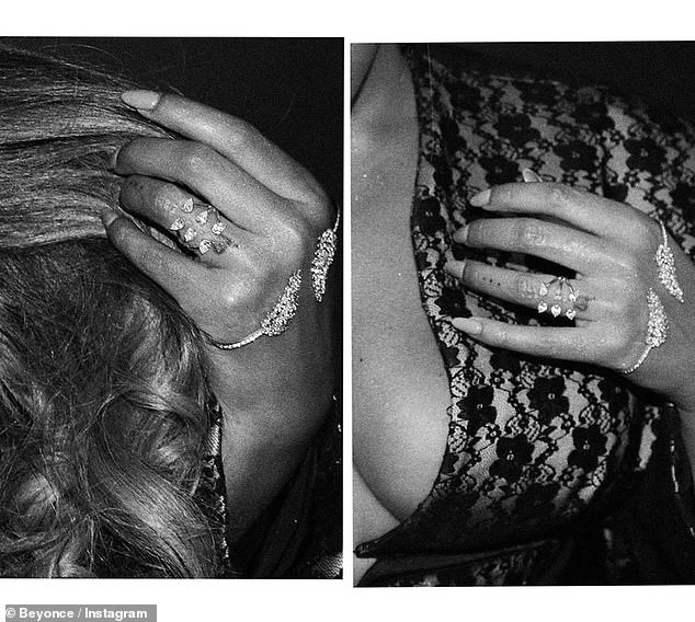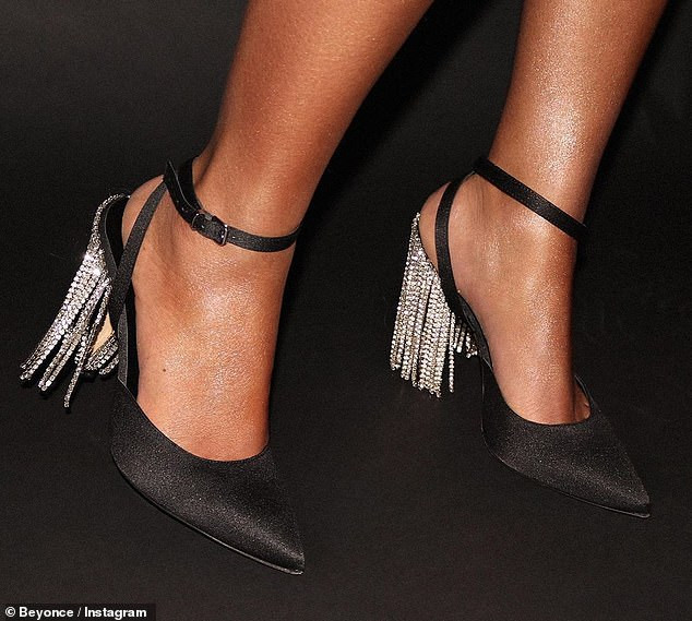 Ngoài vẻ nóng bỏng và bộ cánh "hở trên, ngắn dưới", Beyonce còn khiến dân mạng "tròn mắt" khi đeo kim cương từ đầu đến chân. Đôi giày đen có gắn tua kim cương.