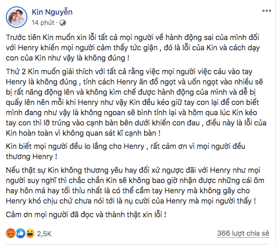 Trước sự phản ứng mạnh mẽ của người hâm mộ, Kin Nguyễn chính thức lên tiếng. Trên trang cá nhân, Kin Nguyễn gửi lời xin lỗi mọi người về hành động sai của mình đối với Henry. "Đó là lỗi của Kin và cách dạy con của Kin như vậy là không đúng”- anh thừa nhận.