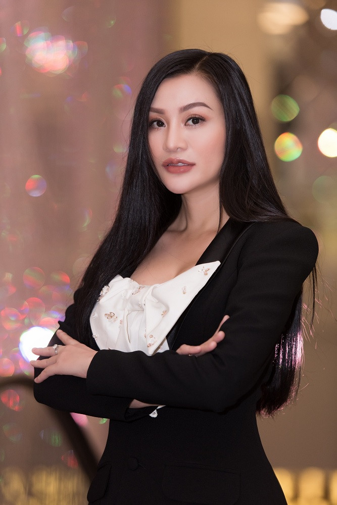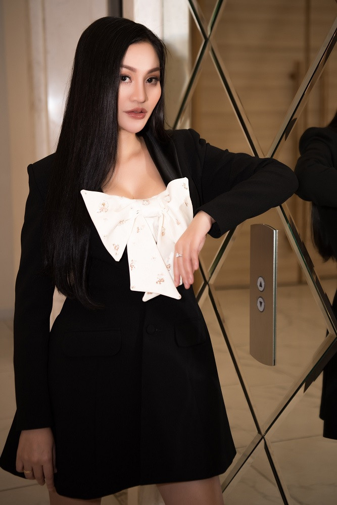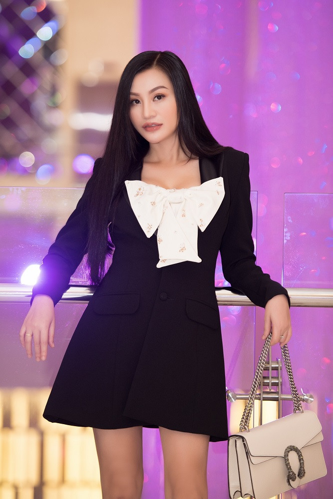 Diện trang phục cùng tone màu đen, Trần Huyền Nhung đẹp thanh lịch, sang trọng bên chồng. Với mái tóc dài thẳng buông thả, váy vest đen phối nơ màu trắng sang, lạ mắt, kết hợp túi Gucci màu kem. Style thời trang của Trần Huyền Nhung luôn là sự am hiểu và người đẹp luôn biết chọn trang phục , phụ kiện phù hợp mỗi khi xuất hiện trong các sự kiện