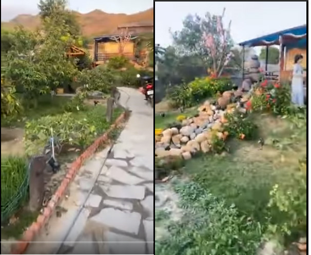 Theo chân Quyền Linh có thể thấy, dẫn vào gia trang là một cây cầu, sau đó đến khoảng sân vô cùng rộng rãi. Khe suối tự tay Lê Tuấn Anh "khiêng từng viên đá" để hoàn thiện.