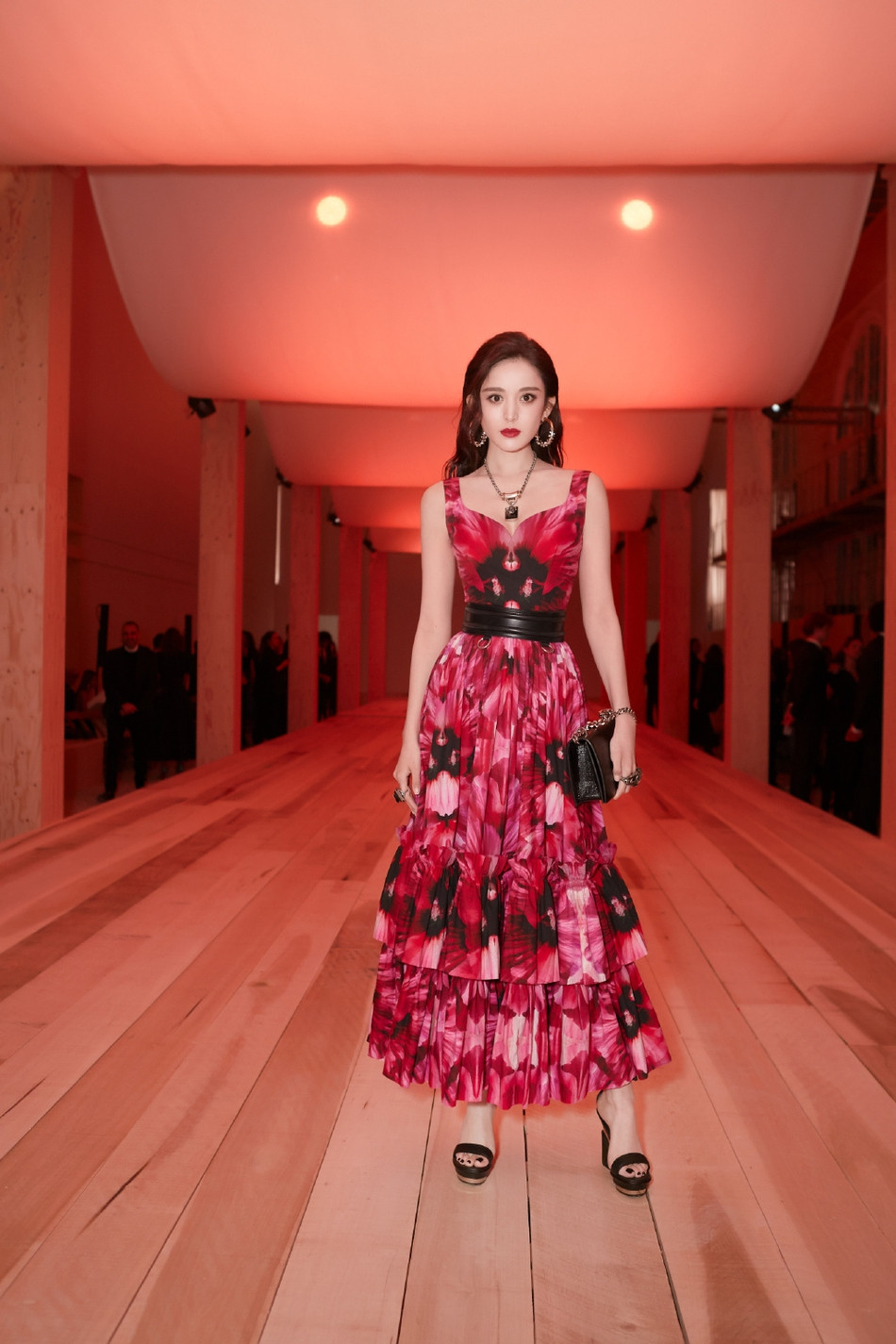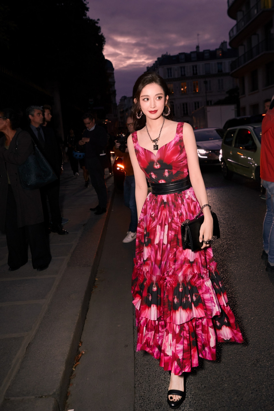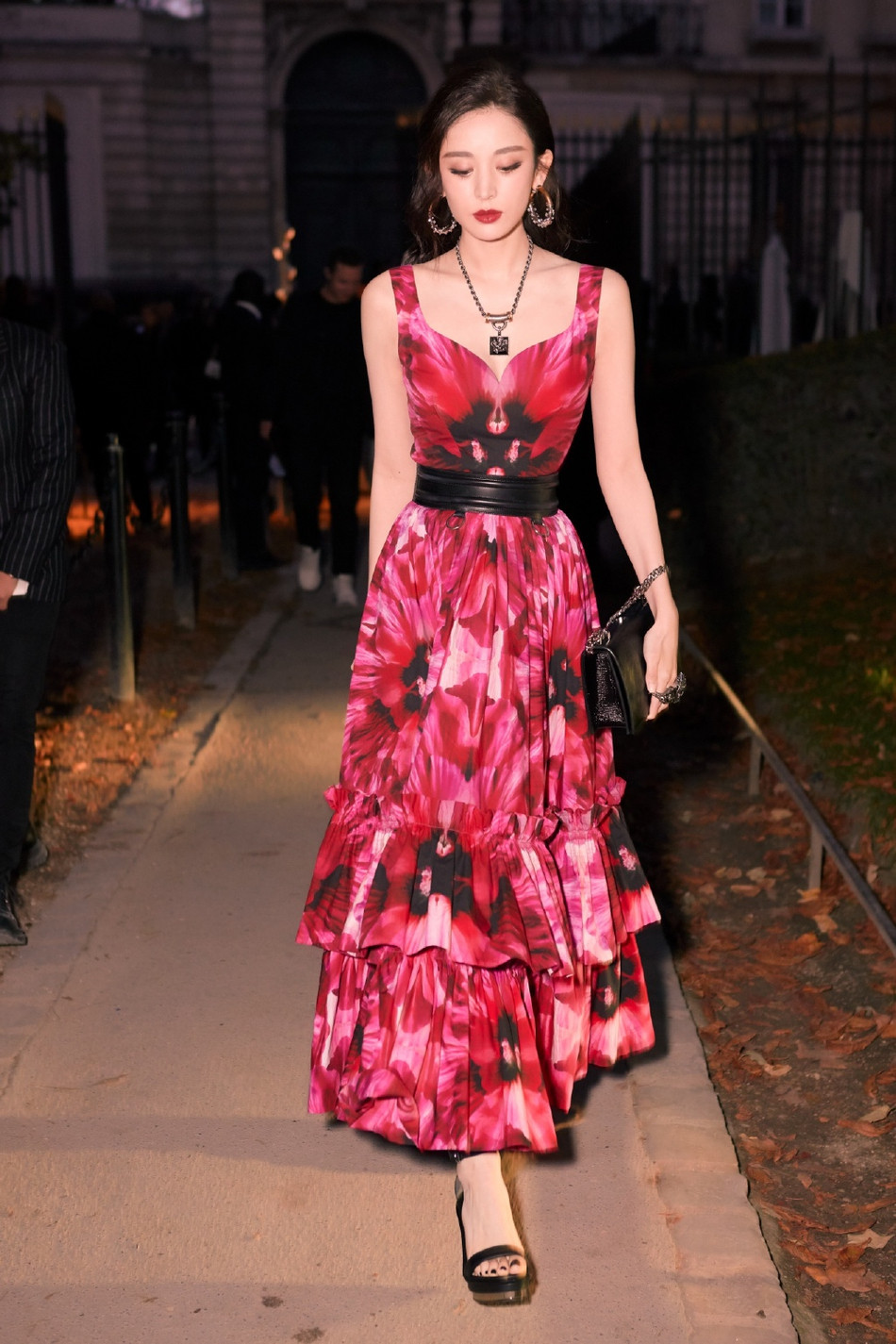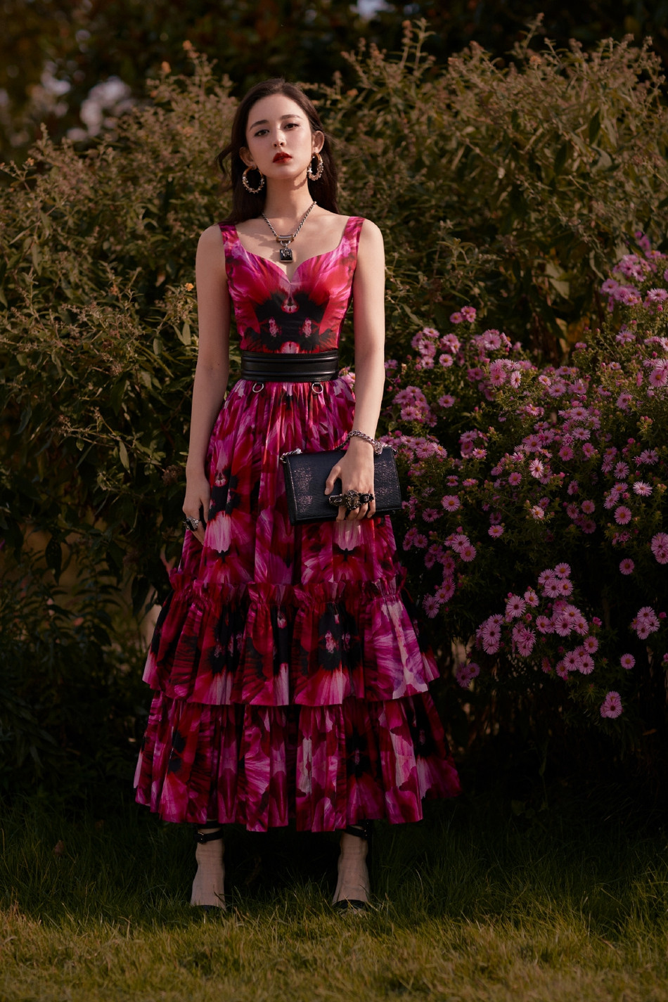 Trong show diễn ngày 30/9 (giờ địa phương), mỹ nhân Tân Cương xuất hiện rực rỡ trong chiếc váy hoạ tiết hoa màu đỏ, hồng, đen.