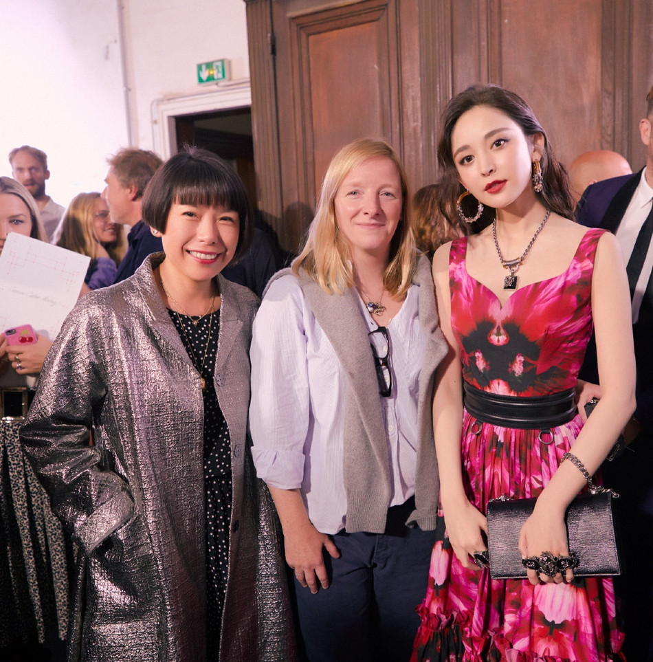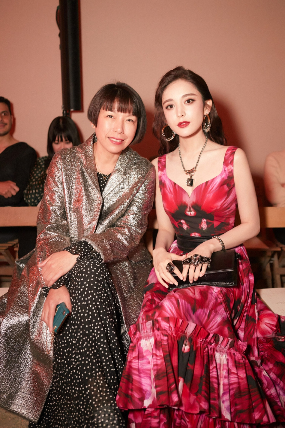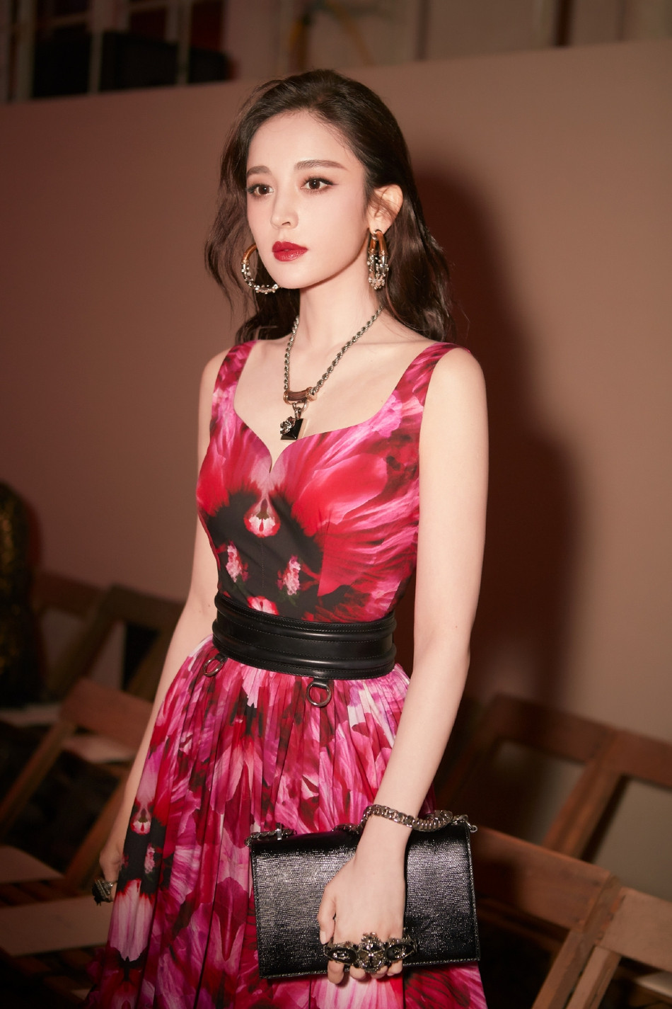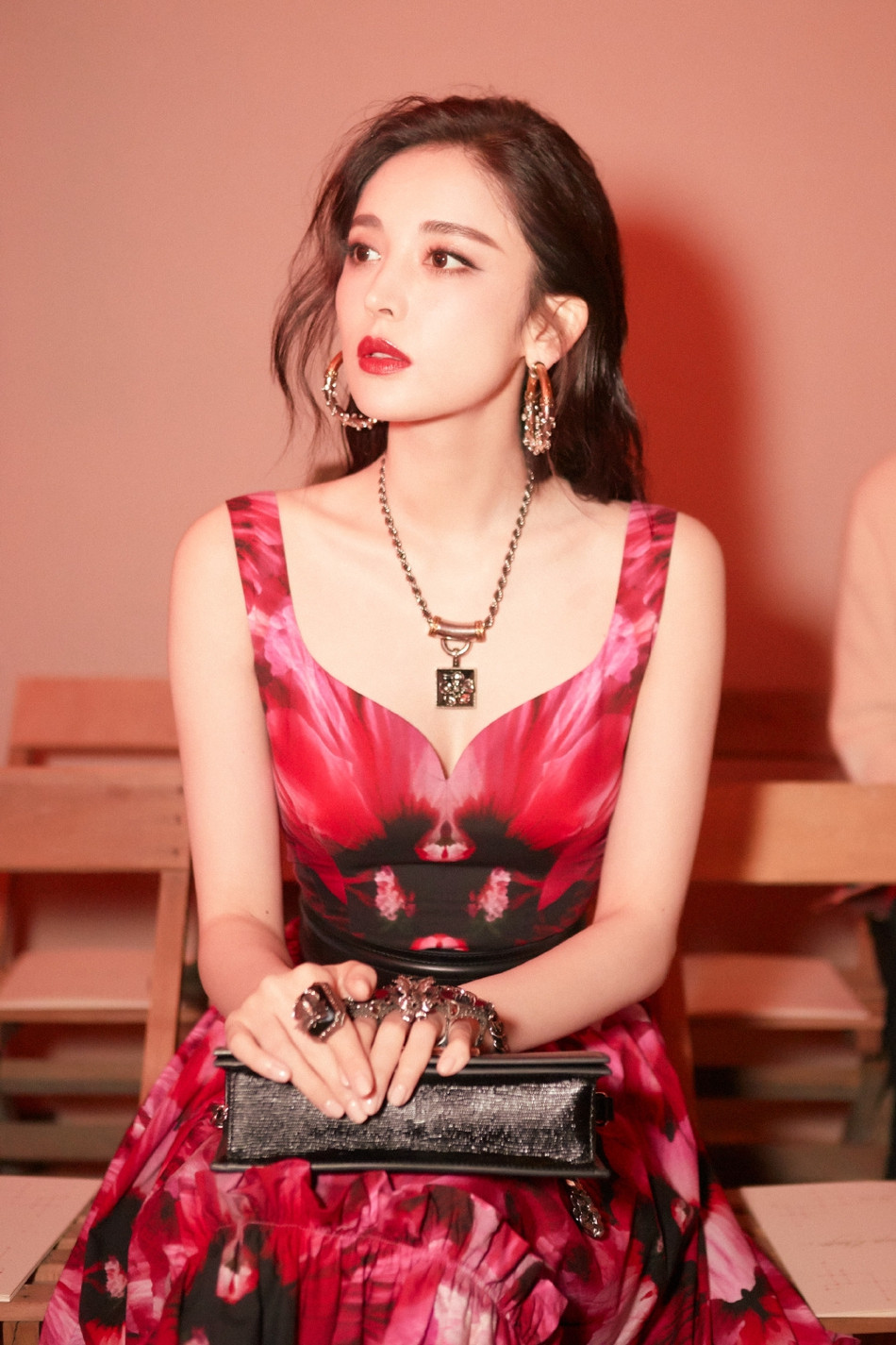 Trong show diễn ngày 30/9 (giờ địa phương), mỹ nhân Tân Cương xuất hiện rực rỡ trong chiếc váy hoạ tiết hoa màu đỏ, hồng, đen.