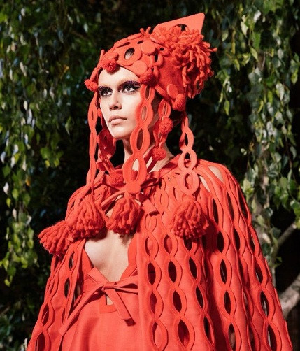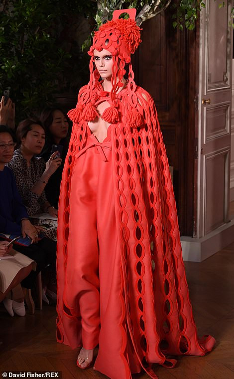 Tối qua, Kaia tỏa sáng nổi bật với diện mạo ấn tượng trong bộ jumpsuit màu đỏ với áo choàng như lưới đánh cá trong show Valentino thu đông 2019 thuộc tuần lễ thời trang Haute Couture tại Paris.
