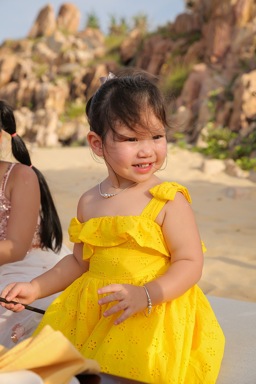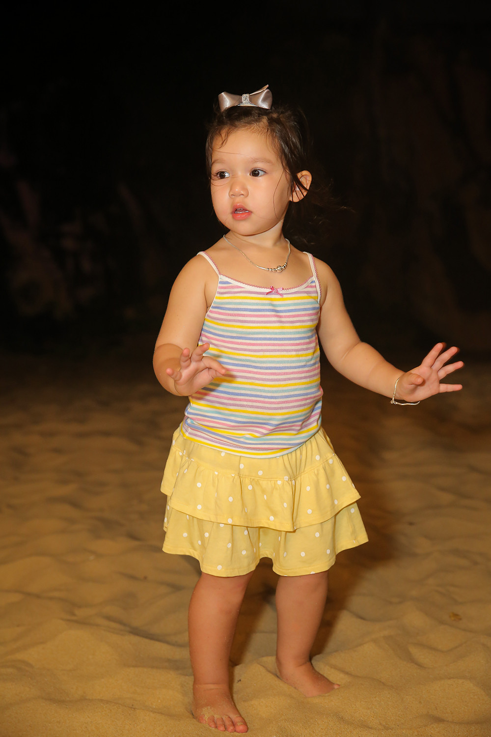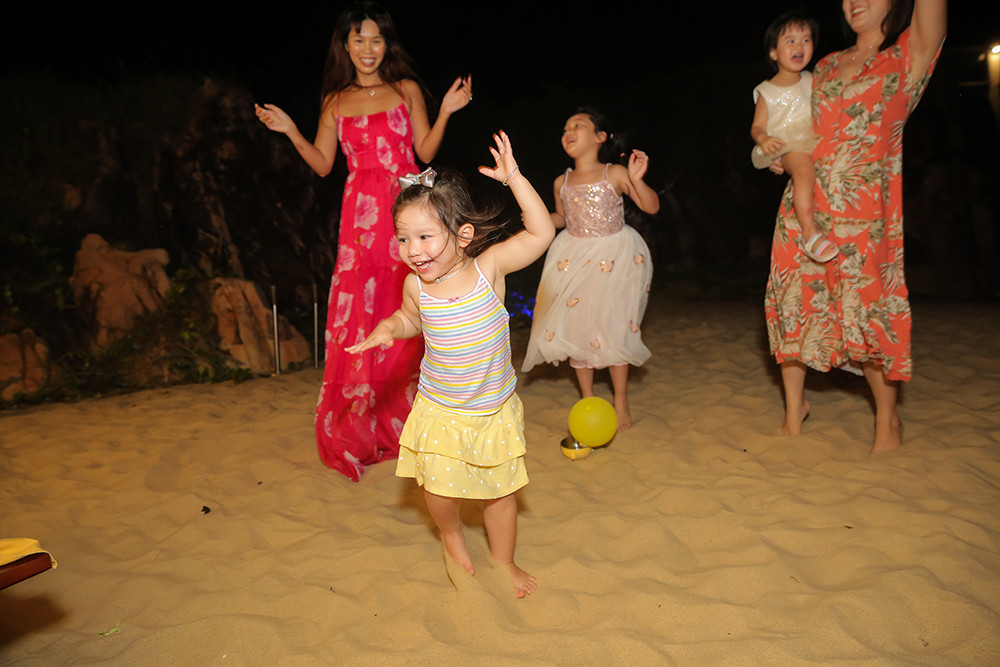 Cô bé thay 2 bộ váy, thích thú nhảy múa trên bãi cát khi nghe tiếng nhạc trong buổi tiệc.