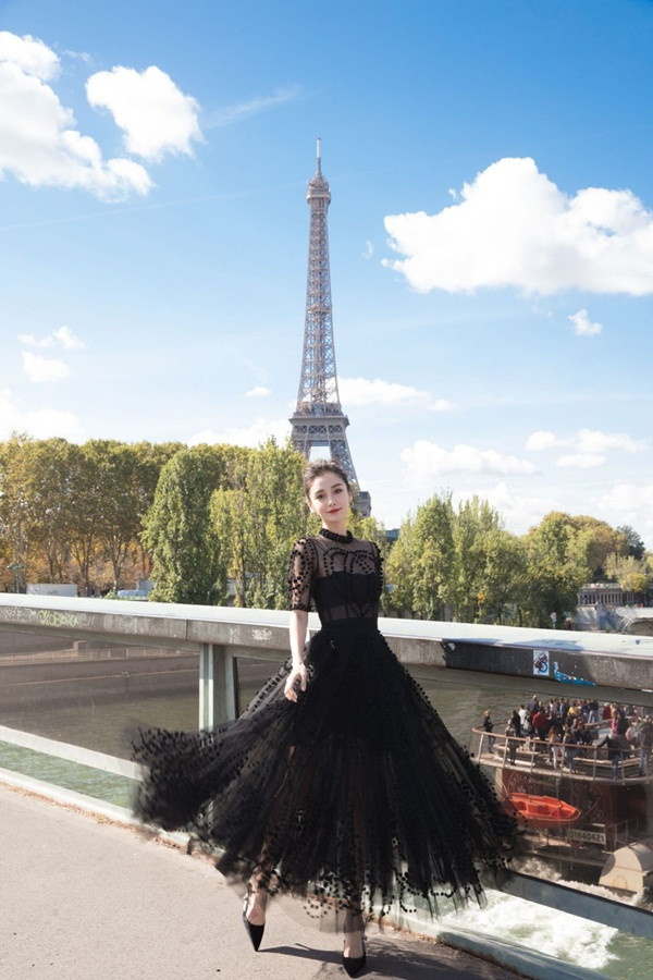 Angelababy xinh đẹp với khung cảnh tháp Eiffel phía xa.