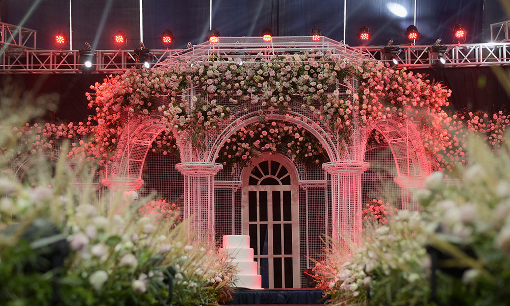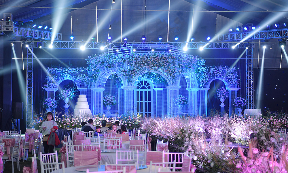Riêng sân khấu có diện tích 150m2 được dựng theo concept lâu đài cổ tích, nơi công chúa béo Quỳnh Anh và hoàng tử sân cỏ Duy Mạnh chính thức thề nguyện, trở thành vợ chồng.