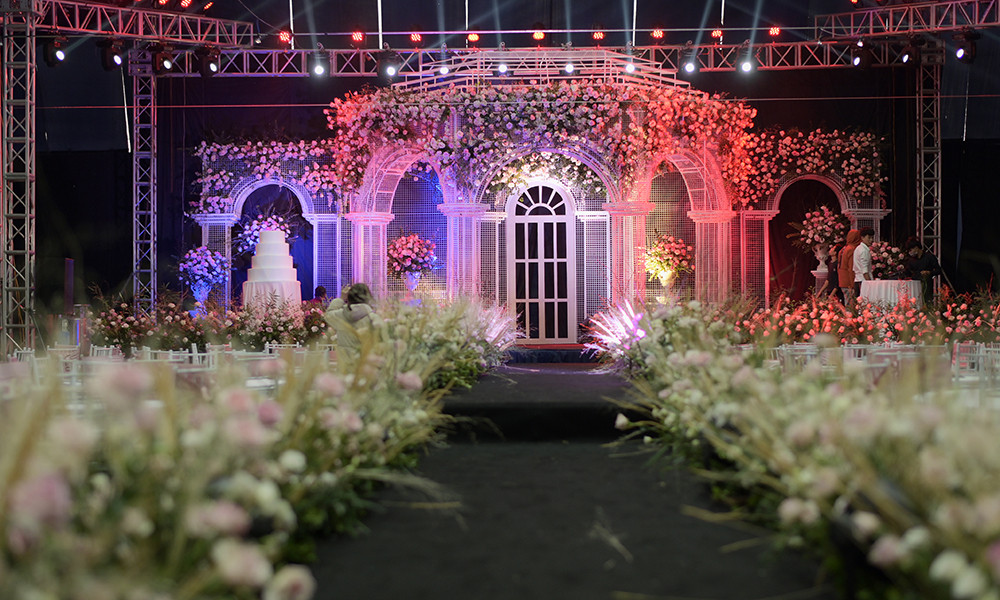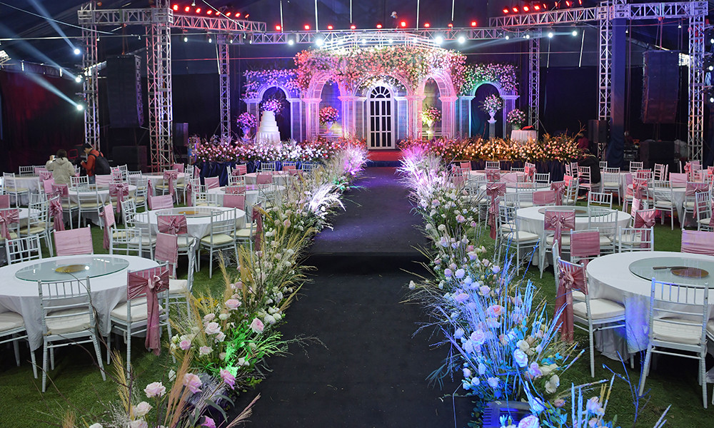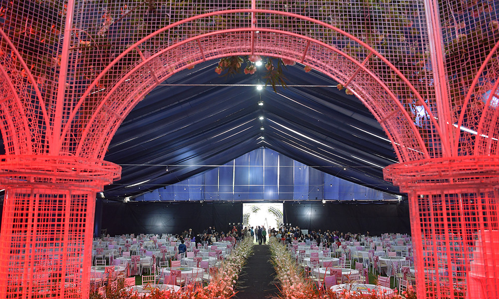 Rạp cưới được che chắn cẩn thận từ lối đi, khu vực check-in để đảm bảo ngày vui không bị ảnh hưởng bởi thời tiết mưa nồm.