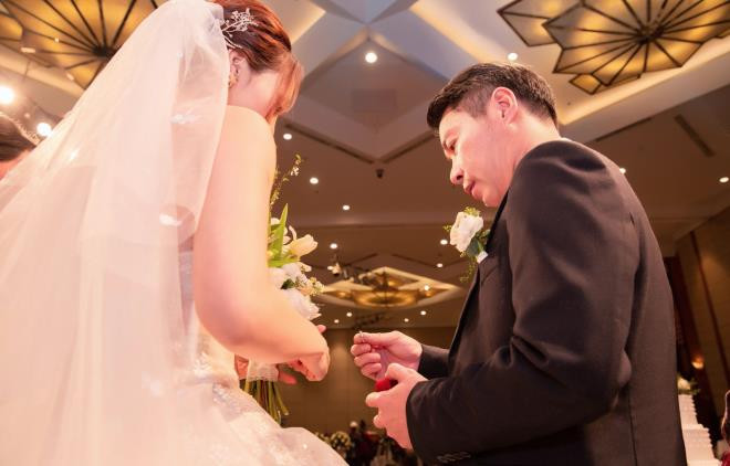 Công Lý trao nhẫn cưới cho cô dâu Ngọc Hà.