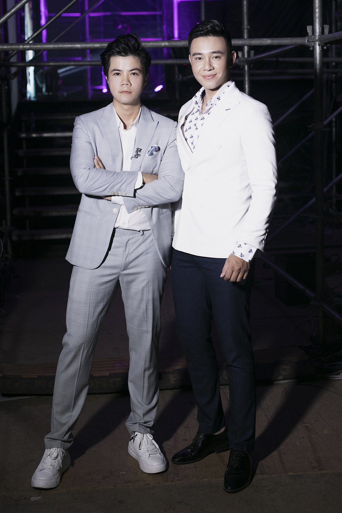 Hai anh chàng ca sĩ Hà thành điển trai Đinh Mạnh Ninh và Đông Hùng chỉn chu với trang phục vest trong cánh gà.