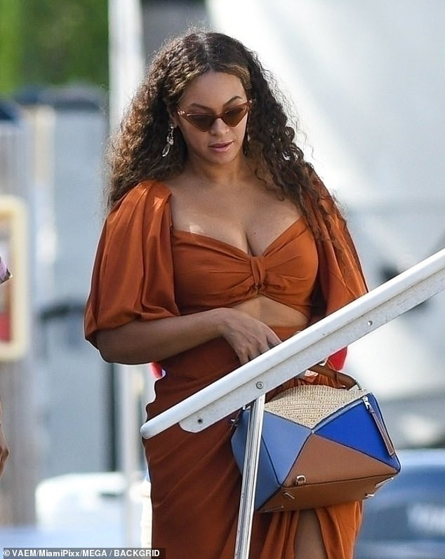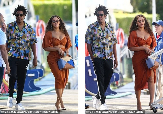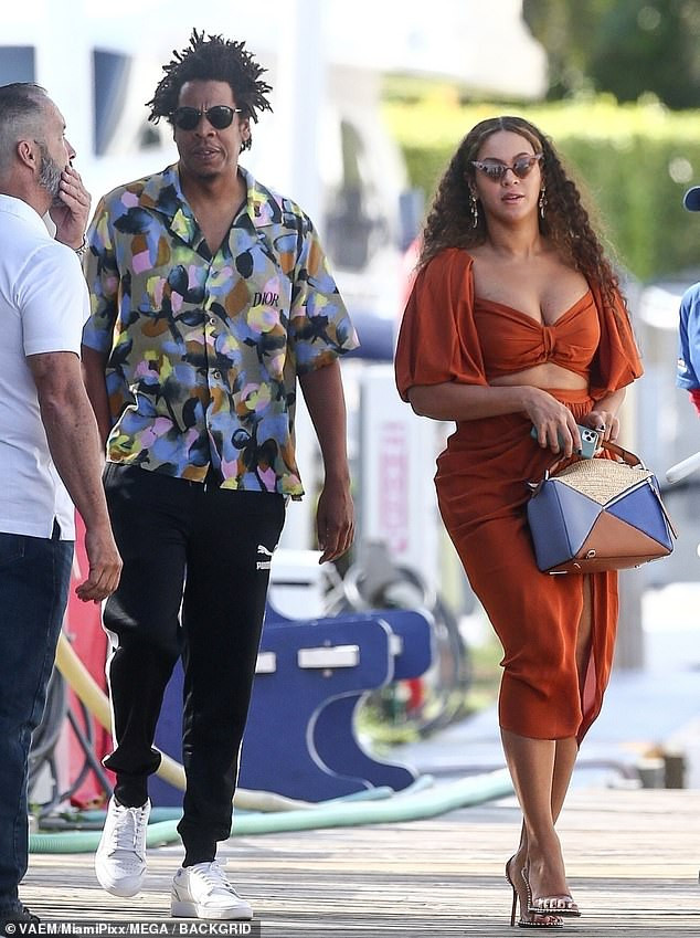 Beyonce xuất hiện trong mái tóc xoăn dài quen thuộc, diện váy hai mảnh "hở trên, xẻ dưới" đầy gợi cảm. Trong khi đó, chồng cô trông thoải mái với áo sơ mi hoa và quần thể thao.