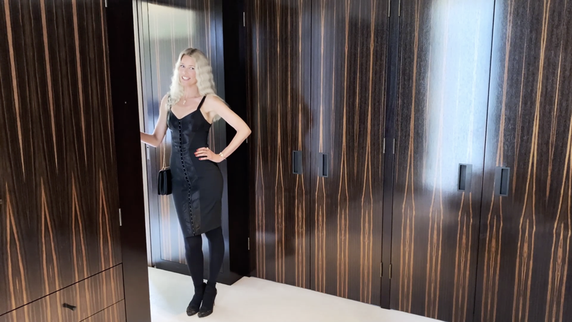 "Nữ hoàng catwalk" thập niên 90 diện đầm đen Versace khoe đôi chân dài trứ danh.