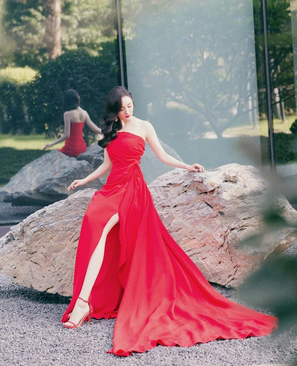 Người đẹp diện đầm đỏ cúp ngực khoe làn da trắng mịn tại sự kiện gần đây.