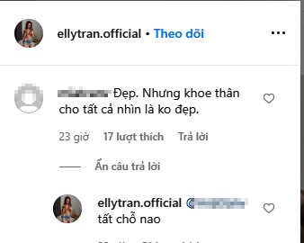 Cụ thể, một người viết: “Tự nhiên thấy Elly thay đổi phong cách, khác với bà mẹ dịu dàng trước đây! Nhìn chung mình không thích Elly trong hình ảnh mới” hay “Đẹp. Nhưng khoe thân cho tất cả nhìn là không đẹp”. Đáp lại những bình luận trái chiều từ người dùng mạng, Elly trần cho biết cô chưa bao giờ cố định lại phong cách nào.