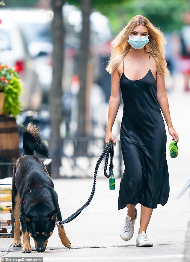 Chiếc váy lụa 2 dây trễ nải phô vóc dáng thon nuột của Emily Ratajkowski. Người đẹp đeo khẩu trang khi bệnh dịch COVID-19 vẫn đang hoành hành ở Mỹ và nhiều nước trên thế giới.