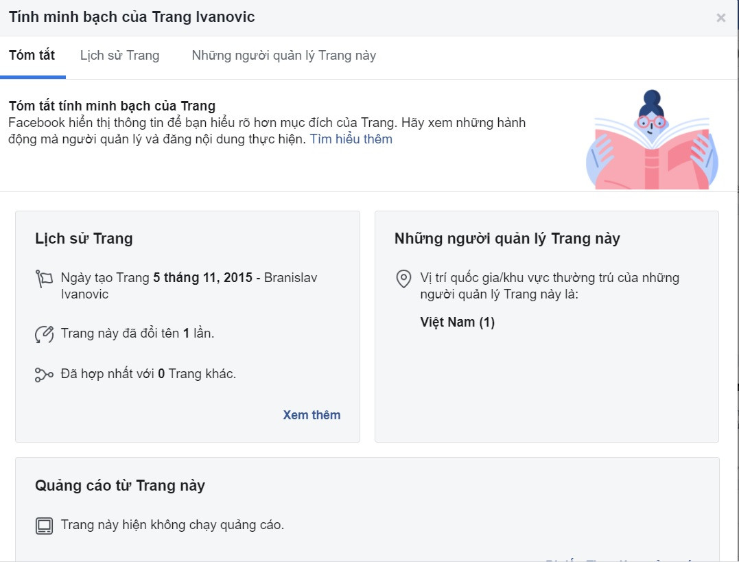 Khi bật vào phần xác minh tính minh bạch của Facebook Ivanovic, vị trí người nắm quyền kiểm soát hiện ở Việt Nam. Hiện tại, trang Facebook đã bị khóa.