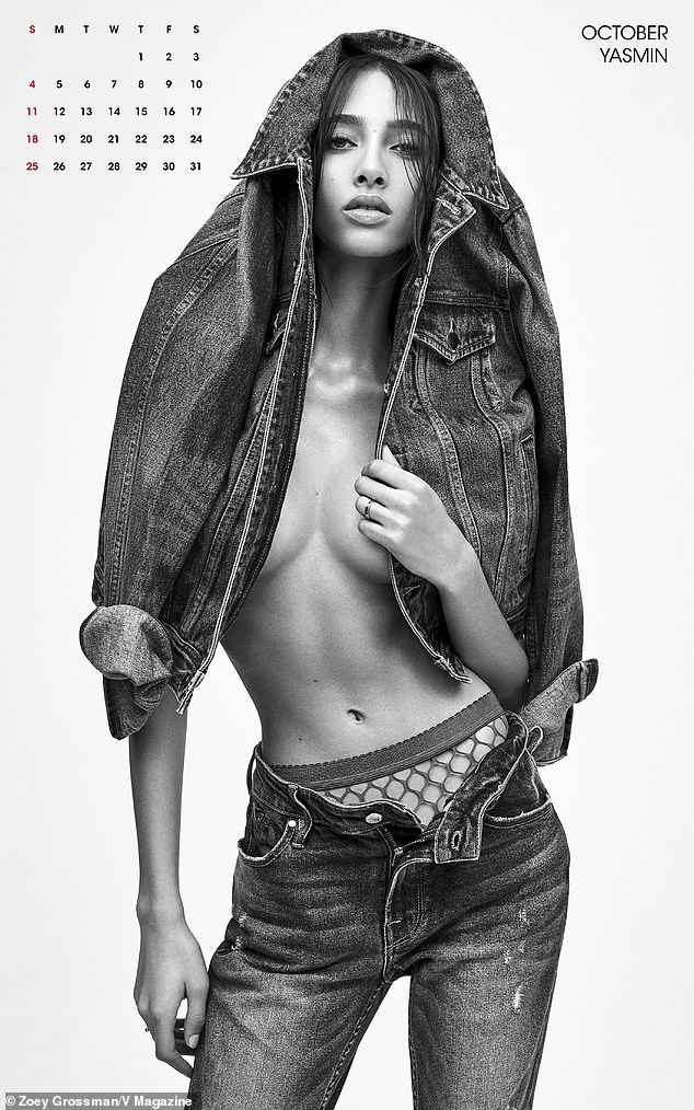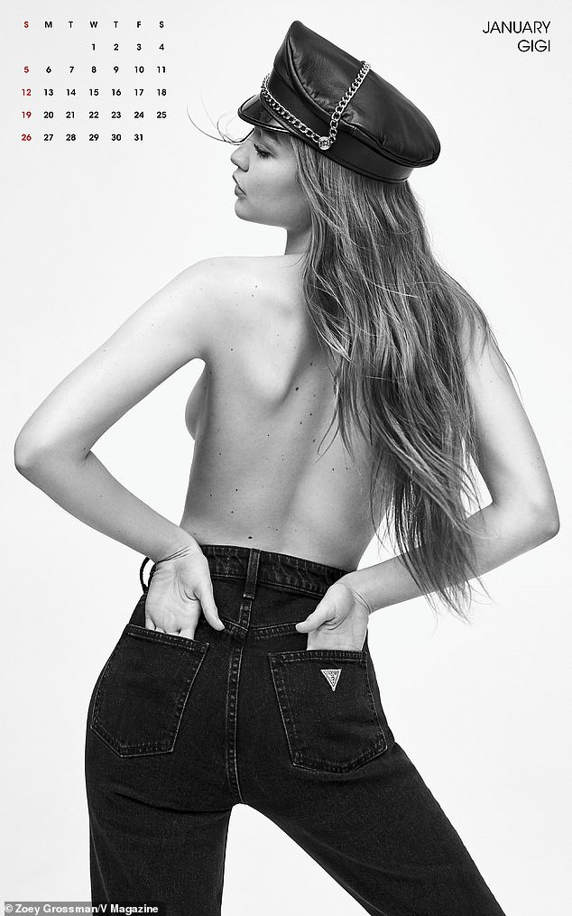Bella Hadid đại diện cho tháng Hai, táo bạo hơn hẳn chị gái khi khoả thân hoàn toàn, dùng áo khoác jean hờ hững che những phần cơ thể nhạy cảm nhất.