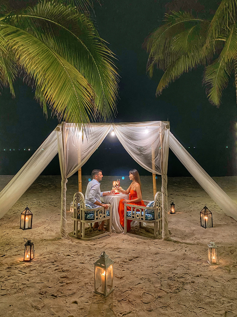 Mặc dù có đưa bé Myla đi cùng nhưng Hà Anh và ông xã Olly vẫn sắp xếp để có bữa tối riêng lãng mạn trên bờ biển.