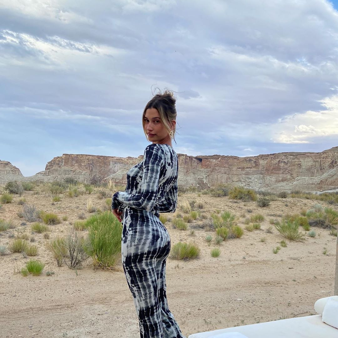 Trong bức ảnh mới nhất chia sẻ trên trang cá nhân 27,7 triệu follow, Hailey Bieber tự tin khoe mặt mộc không phấn son và body gợi cảm trong bộ bikini họa tiết bò sữa của thương hiệu Lali + Layla.